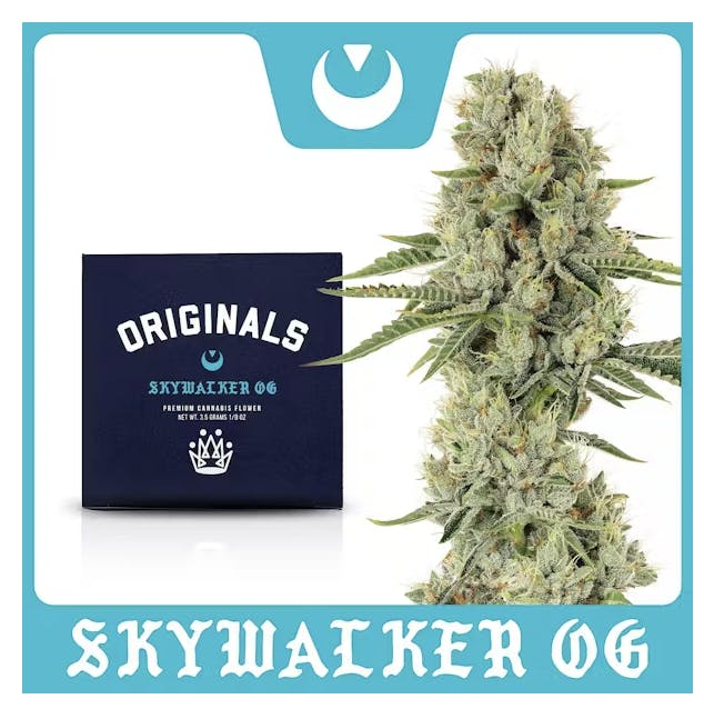 Skywalker from Originals Family Farm Cultivation is a force to be reckoned with. An evenly balanced hybrid, this strain comes from crossing Blueberry and Mazar-I-Sharif, which both are famous in their own rights. Find this strain available in our premium indoor eighths, small buds, and half ounces. Reeking of blueberries and earthy spice, Skywalker has a pungent aroma that entices you in. One hit might provide a mellow body high and uplifting mental clarity. This is a strain you can smoke throughout the day that may benefit those with ADHD, migraines, and PMS.
