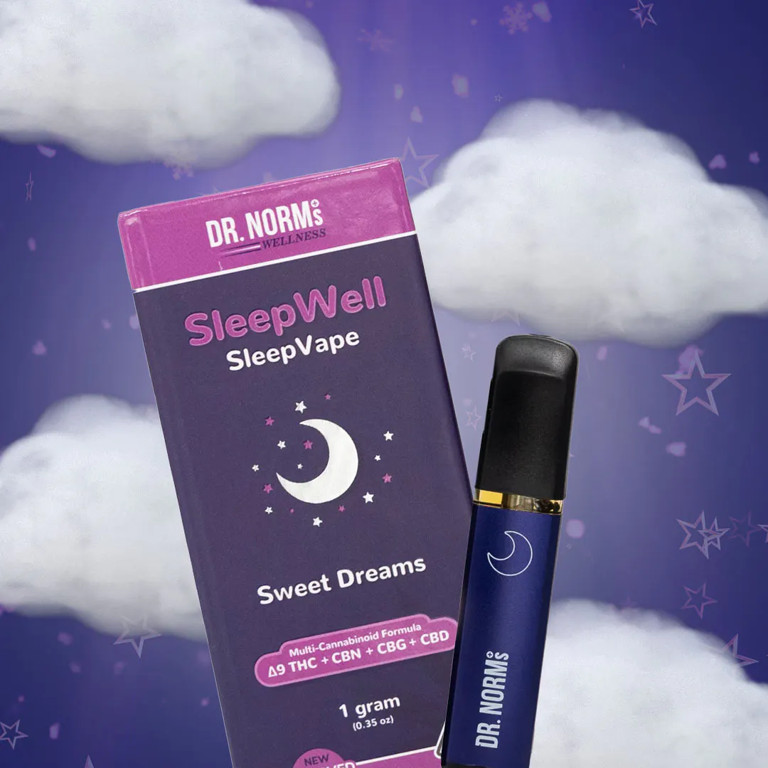 The second SKU in Dr. Norm’s SleepWell sub brand is our disposable, rechargeable Sleep Vape. It has a Full Gram of cannabinoids including THC, CBN, CBG and CBD - the 4 most effective cannabinoids for sleep. It contains approximately 55% THC, 20% CBN, 10% CBG and 10% CBD. It is 90% cannabinoids and 10% terpenes - NO filler. This is the ONLY sleep vape in CA that contains all 4 of these cannabinoids. The formulation is science based in ideal ratios to create optimal effect. This vape has 3 heat settings so that the user can determine how much THC they want to draw each time. This is a first for a disposable/rechargeable device to have temperature control settings. The vape comes with a charging cable for the USB-C charging port.