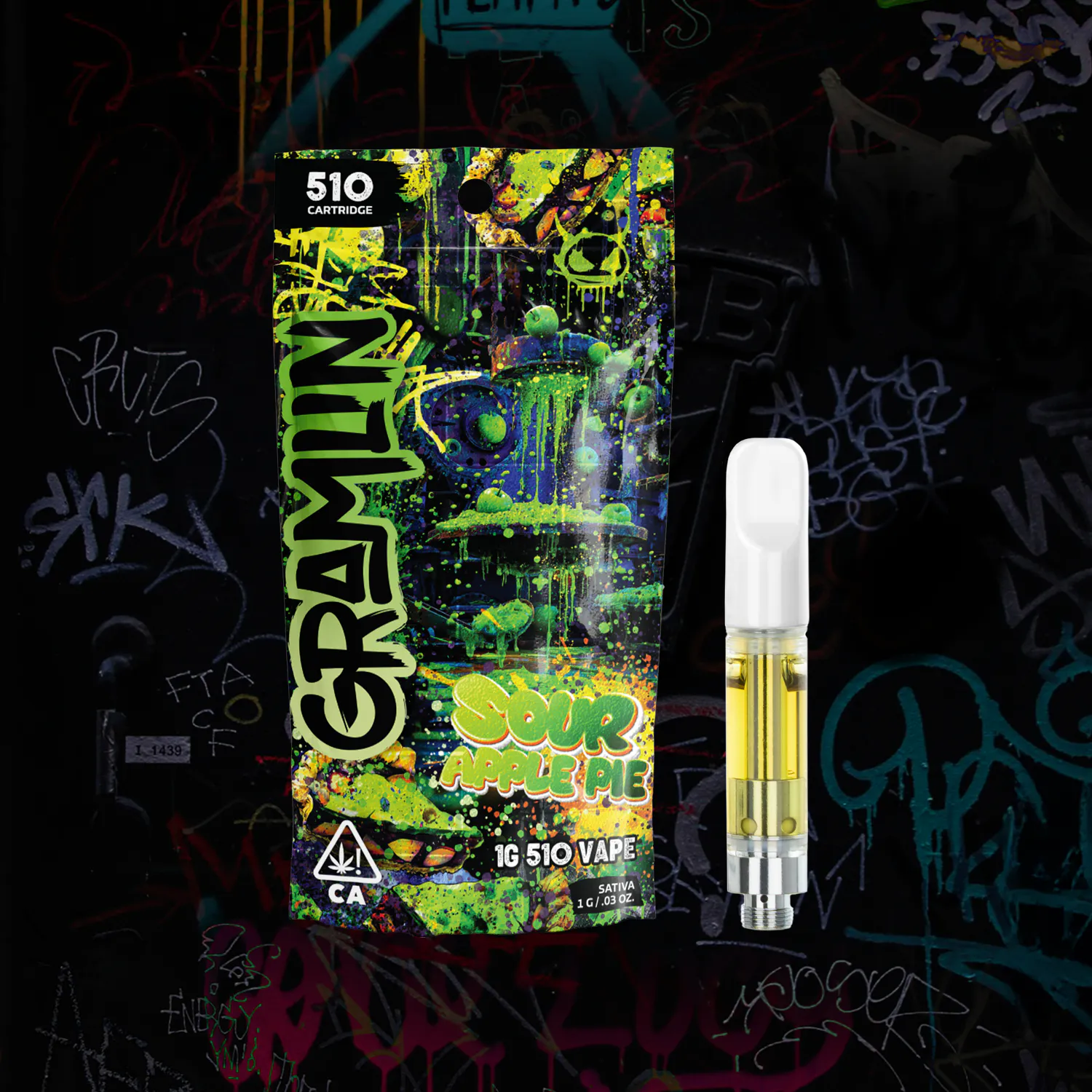 This full gram 510 Vape Cartridge is ready to smoke out of the bag. With tart green apple and sweet doughy flavors, this Sour Apple Pie sativa vape's quality ceramic coil means big flavor and bigger clouds. Battery not included. Rip to unlock Gramlin Mode. gramlinmode.com